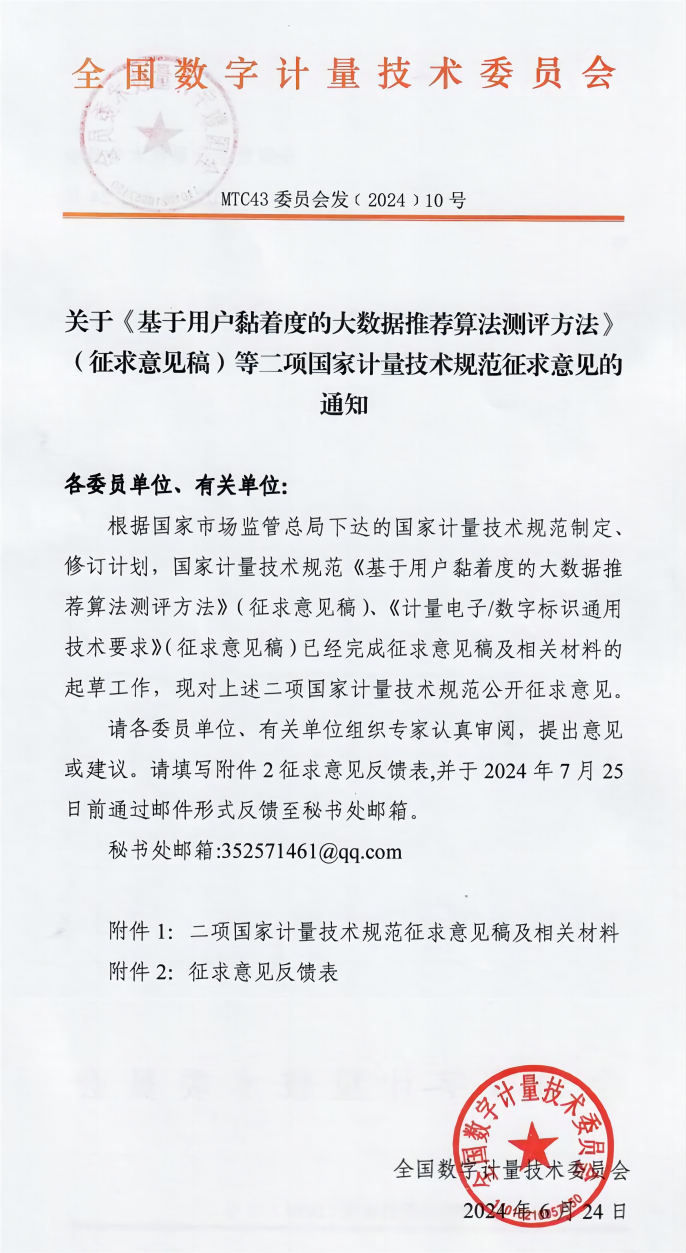 根据《市场监管总局办公厅关于印发2023年国家计量技术规范项目制定、修订及宣贯计划的通知》,全国数字计量技术委员会会完成《基于用户黏着度的大数据推荐算法测评方法》等2项国家计量技术规范文件编制工作。特向全国各有关单位、专家征求意见和建议,希望专家在百忙之中予以审查。敬请填写征求意见表,于2024年7月25日前将修改意见反馈至秘书处。反馈邮箱:352571461@qq.com。附件:《基于用户黏着度的大数据推荐算法测评方法》征求意见稿、编制说明、征求意见表 《计量电子/数字标识通用技术要求》征求意见稿、编制说明、征求意见表全国数字计量技术委员会