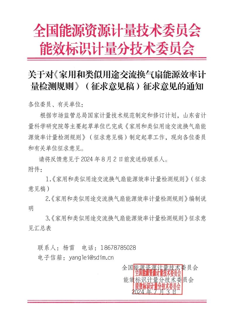 根据《市场监管总局办公厅关于印发2023年国家计量技术规范项目制定、修订及宣贯计划的通知》,全国能源资源计量技术委员会能效标识计量分技术委员会完成《家用和类似用途交流换气扇能源效率计量检测规则》(征求意见稿)文件编制工作。特向全国各有关单位、专家征求意见和建议,希望专家在百忙之中予以审查。敬请填写征求意见表,于2024年8月2日前将修改意见反馈至秘书处。联系人:杨雷,18678785028,yanglei@sdim.cn。附件:《家用和类似用途交流换气扇能源效率计量检测规则》征求意见稿、编制说明、征求意见表 全国能源资源计量技术委员会