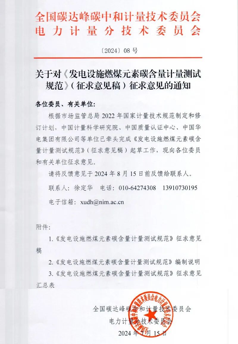 全国碳达峰碳中和计量技术委员会电力计量分技术委员会关于《发电设施燃煤元素碳含量计量测试规范》征求意见通知