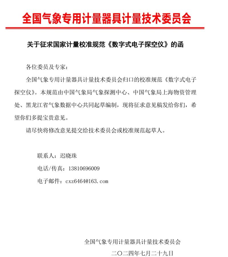 根据《市场监管总局办公厅关于印发2023年国家计量技术规范项目制定、修订及宣贯计划的通知》,全国气象专用计量器具计量技术委员会完成《数字式电子探空仪》(征求意见稿)文件编制工作。特向全国各有关单位、专家征求意见和建议,希望专家在百忙之中予以审查。请填写征求意见表反馈至秘书处。联系方式:迟晓珠,13810696009,cxz6464@163.com。附件:《数字式电子探空仪》征求意见稿、编制说明、征求意见表 全国气象专用计量器具计量技术委员会
