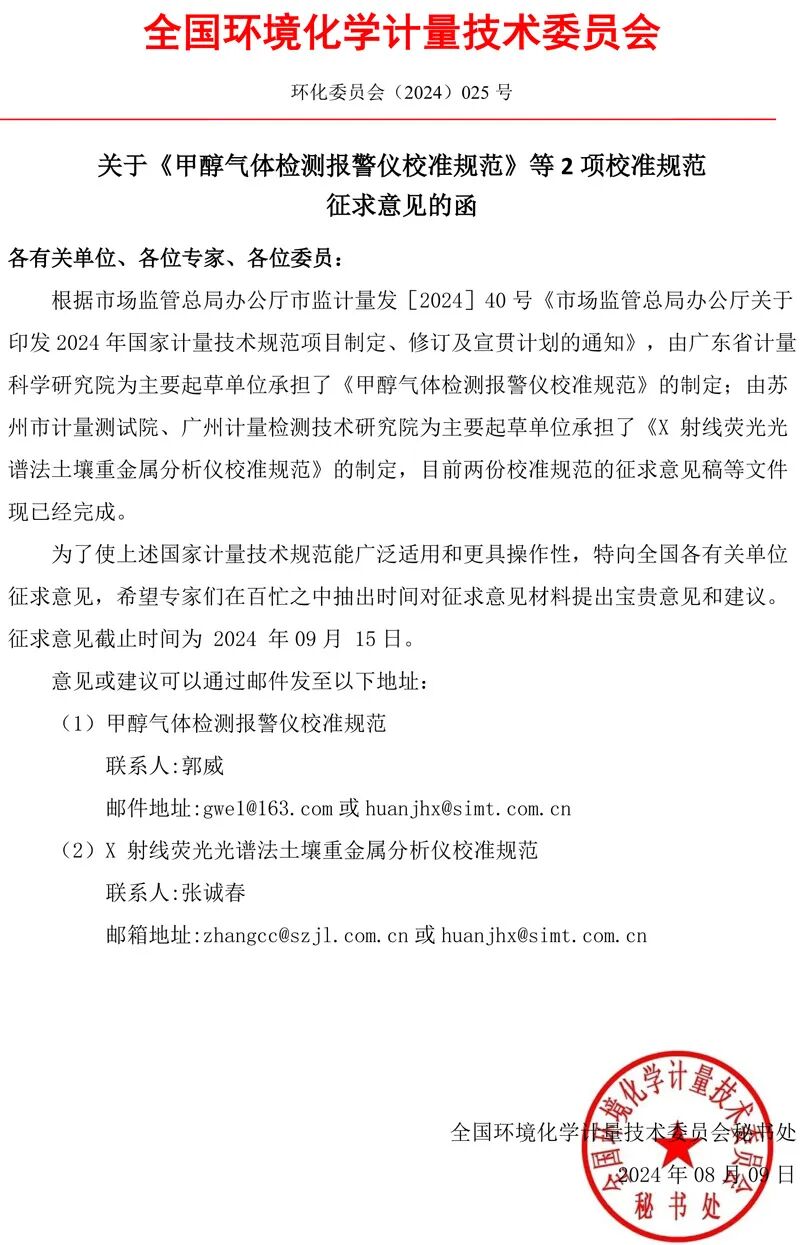 根据《市场监管总局办公厅关于印发2023年国家计量技术规范项目制定、修订及宣贯计划的通知》,全国环境化学计量技术委员会完成《甲醇气体检测报警仪校准规范》(征求意见稿)等2项国家计量技术规范文件编制工作。特向全国各有关单位、专家征求意见和建议,希望专家在百忙之中予以审查。敬请填写征求意见表,于2024年9月15日前将修改意见反馈至秘书处。联系方式:郭威,gwel@163.com;张诚春,zhangcc@szjl.com.cn。附件:《甲醇气体检测报警仪校准规范》征求意见稿、编制说明、征求意见表 《X射线荧光光谱法土壤重金属分析仪校准规范》征求意见稿、编制说明、征求意见表 全国环境化学计量技术委员会