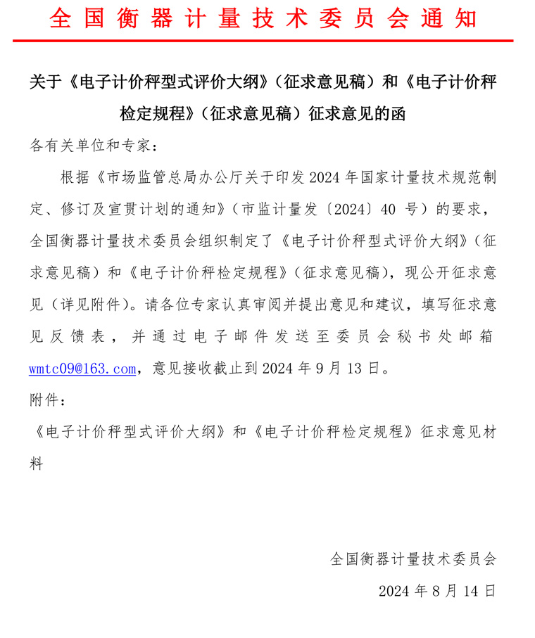 根据《市场监管总局办公厅关于印发2024年国家计量技术规范制定、修订及宣贯计划的通知》(市监计量发〔2024〕40 号)的要求,全国衡器计量技术委员会组织制定了《电子计价秤型式评价大纲》(征求意见稿)和《电子计价秤检定规程》(征求意见稿),现公开征求意见(详见附件)。请各位专家认真审阅并提出意见和建议,填写征求意见反馈表,并通过电子邮件发送至委员会秘书处邮箱wmtc09@163.com,意见接收截至2024年9月13日。