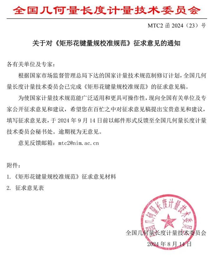 根据《市场监管总局办公厅关于印发2024年国家计量技术规范项目制定、修订及宣贯计划的通知》,全国几何量长度计量技术委员会完成《矩形花键量规校准规范》(征求意见稿)文件编制工作。特向全国各有关单位、专家征求意见和建议,希望专家在百忙之中予以审查。敬请填写征求意见表,于2024年9月14日前将修改意见反馈至秘书处。联系方式:mtc2@nim.ac.cn。附件:《矩形花键量规校准规范》征求意见稿、编制说明、征求意见表 全国几何量长度计量技术委员会