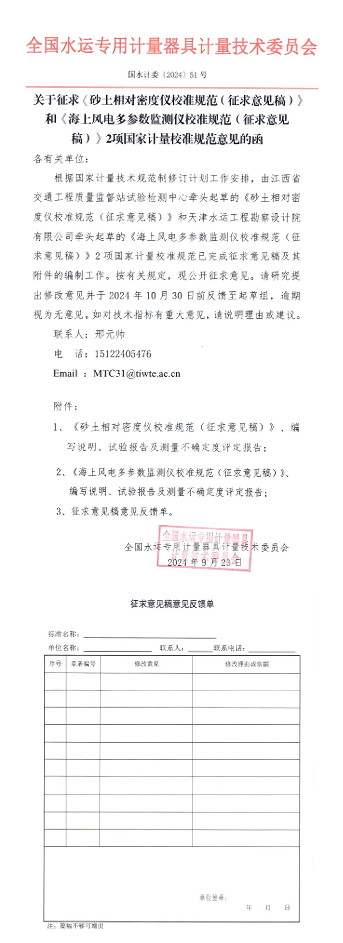 根据《市场监管总局办公厅关于印发2024年国家计量技术规范项目制定、修订及宣贯计划的通知》(市监计量发〔2024〕40号),全国水运专用计量器具计量技术委员会完成《砂土相对密度仪校准规范》(征求意见稿)等2项国家计量技术规范文件编制工作。特向全国各有关单位、专家征求意见和建议,希望专家在百忙之中予以审查。敬请填写征求意见表,于2024年10月30日前将修改意见反馈至秘书处。联系方式:邢元帅,15122405476,mtc31@tiwte.ac.cn。附件:《砂土相对密度仪校准规范》征求意见稿、编制说明、征求意见表 《海上风电监测仪校准规范》征求意见稿、编制说明、征求意见表 全国水运专用计量器具计量技术委员会