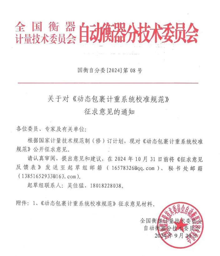 根据《市场监管总局办公厅关于印发2024年国家计量技术规范项目制定、修订及宣贯计划的通知》(市监计量发〔2024〕40号),全国衡器计量技术委员会自动衡器分技术委员会完成《动态包裹计重系统校准规范》(征求意见稿)文件编制工作。特向全国各有关单位、专家征求意见和建议,希望专家在百忙之中予以审查。敬请填写征求意见表,于2024年10月31日前将修改意见反馈至秘书处。联系方式:吴佳猛,18018228038,16578326@qq.com。附件:《动态包裹计重系统校准规范》征求意见稿、编制说明、征求意见表 全国衡器计量技术委员会自动衡器分技术委员会
