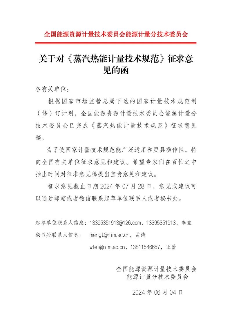 根据国家市场监管总局下达的国家计量技术规范制(修)订计划,全国能源资源计量技术委员会能源计量分技术委员会完成《蒸汽热能计量技术规范》(征求意见稿)文件编制工作。为使规范广泛适用,更具操作性,现向全国各有关单位公开征求意见。请各单位于2024年7月28日前将修改意见反馈至联系人:李宝,13395351913,13395351913@126.com。附件:《蒸汽热能计量技术规范》征求意见稿、编制说明、征求意见表