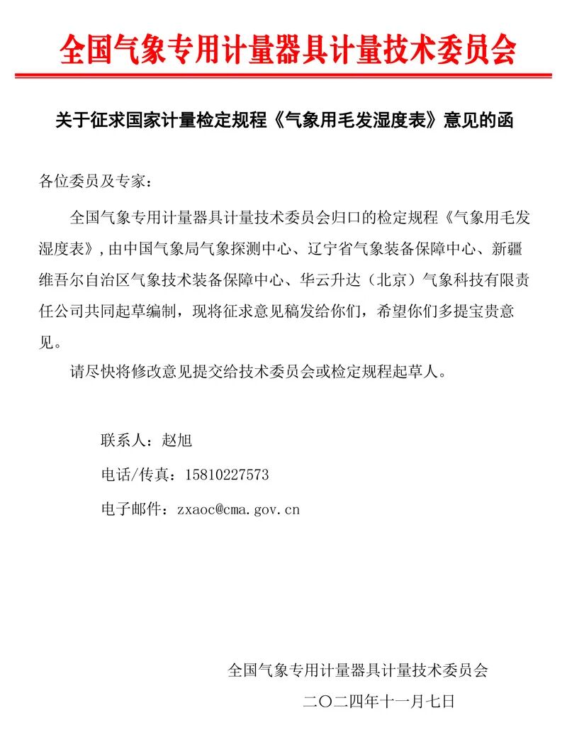 根据《市场监管总局办公厅关于印发2024年国家计量技术规范项目制定、修订及宣贯计划的通知》(市监计量发〔2024〕40号),全国气象专用计量器具计量技术委员会完成《气象用毛发湿度表》(征求意见稿)文件编制工作。特向全国各有关单位、专家征求意见和建议,希望专家在百忙之中予以审查。请填写征求意见表反馈至秘书处。联系方式:赵旭,15810227573,zxaoc@cma.gov.cn。附件:《气象用毛发湿度表》征求意见稿、编制说明、征求意见表